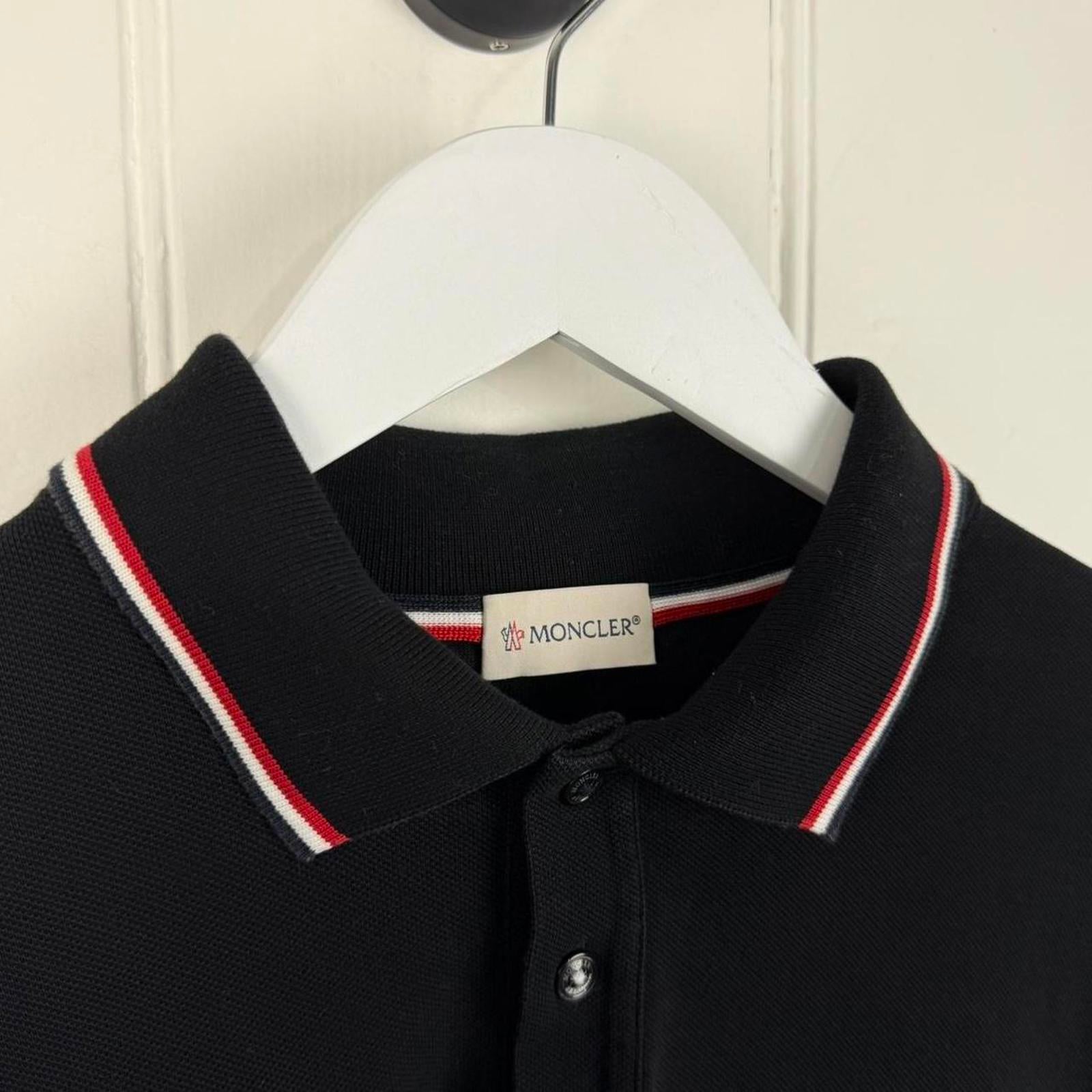 moncler, black polo, cotton pique, embroidered logo, slim fit, classic style, long sleeve, signature tipping, casual luxury, refined